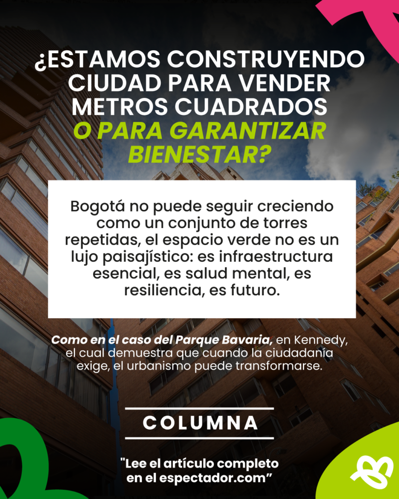 Como ingeniera, entiendo que todo sistema debe ser eficiente para funcionar. Sin embargo, el modelo inmobiliario actual en Bogotá parece ir en contravía de esta lógica. Cada vez las viviendas son más pequeñas —algunas de menos de 30 metros cuadrados—, eliminando espacios vitales para la socialización. Los que somos de otras generaciones recordamos las reuniones en casa de nuestros padres, donde cabían amigos, vecinos y familiares. Hoy, esa carencia de espacio privado nos obliga a mercantilizar el encuentro: para ver a un amigo hay que ir a un bar o a un restaurante. Esto convierte al espacio público, y especialmente al espacio verde, no en un adorno paisajístico, sino en una infraestructura esencial para la vida.